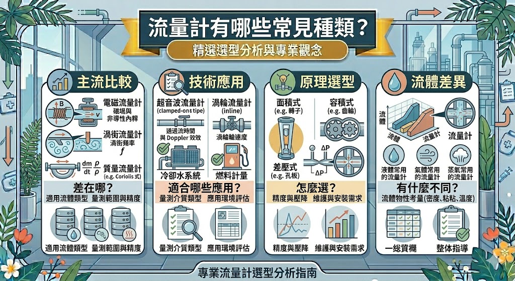 常見種類大致可以分成幾個方向。電磁流量計適合導電液體;渦街流量計常見於液體、氣體與蒸氣;Coriolis 質量流量計適合高精度質量流量量測;超音波流量計常被用在非侵入式或夾管式應用;渦輪流量計適合較乾淨、穩定的流體;另外還有差壓式、容積式與面積式流量計。